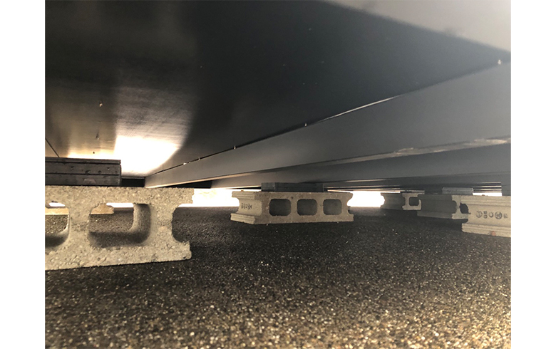 ユニットハウス内に250kg程度の防音室を設置したいと相談を受けました。厚み15mmの既存の床に、厚み12mmの合板を重ね貼りして27mm厚にし、コンクリートの地面と床下の鉄骨フレームの間に、ブロックとスペーサーを挿入して根太下補強を行うことで対応させていただきました。