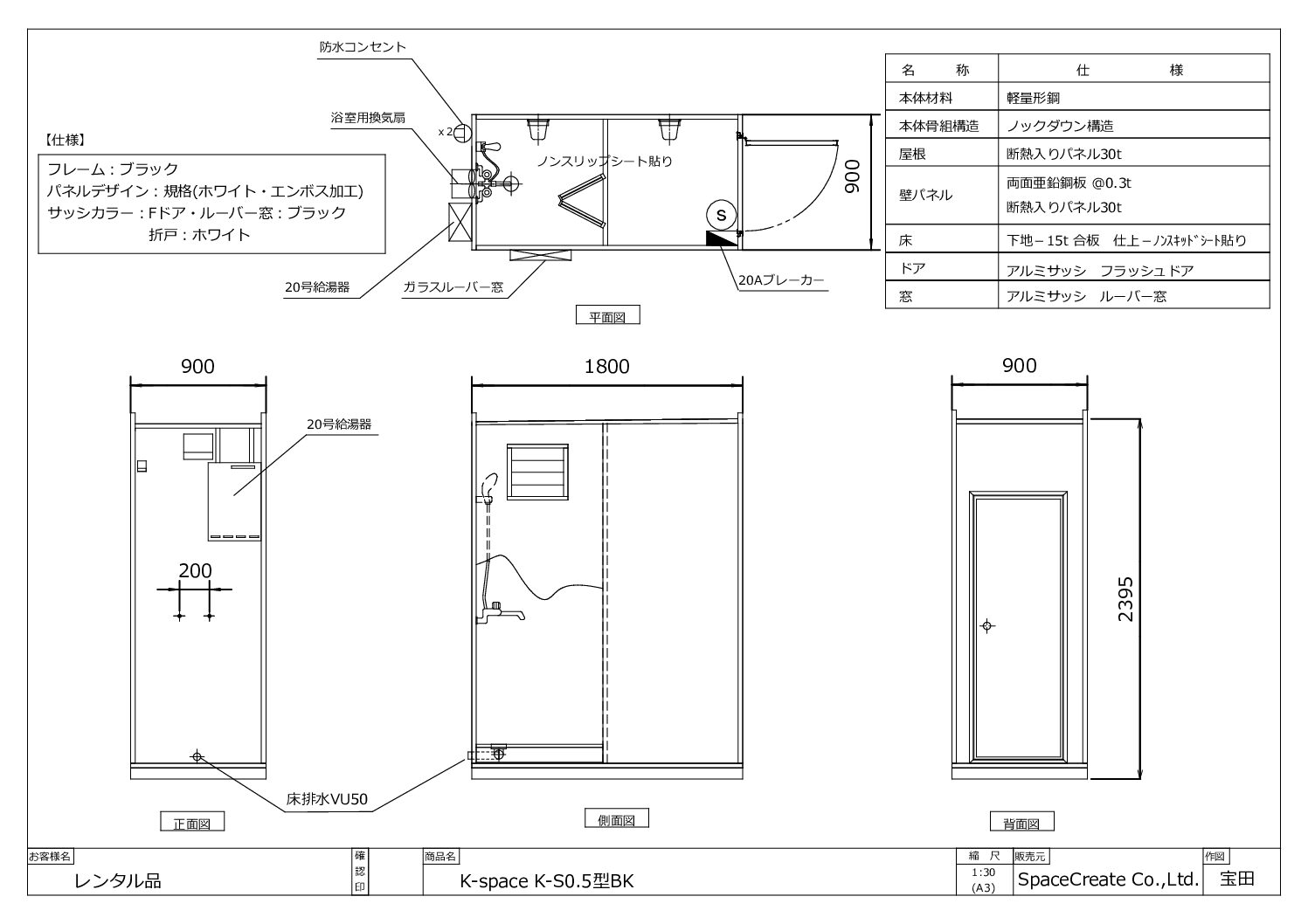 | 寸法外寸 | 幅:1800mm × 奥行き:900mm × 高さ:2395mm |